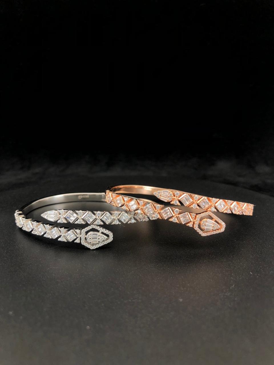 A premium cuff bracelet featuring a sparkling square-cut crystal centerpiece, available in both silver and rose-gold finishes.