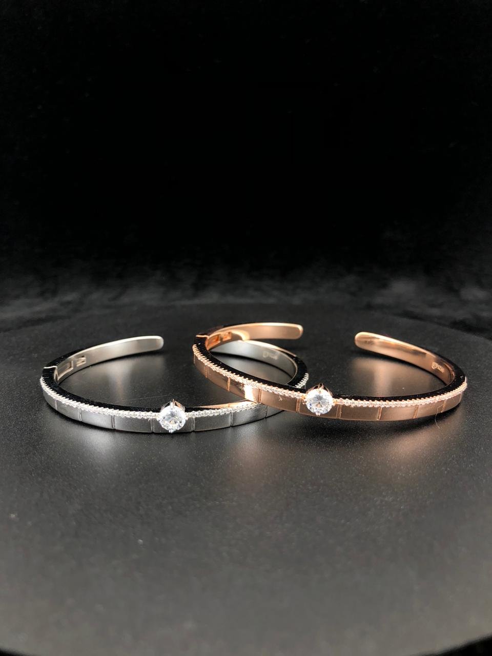 A premium cuff bracelet featuring a sparkling square-cut crystal centerpiece, available in both silver and rose-gold finishes.